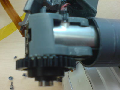 Free the gear wheel and the neck tilt from dirt and plastic dust. Put the wheel and the neck tilt together and check if it fits. Find the position to glue it.