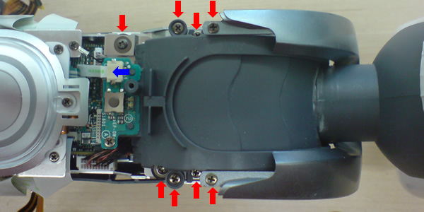 First you have to remove the Aibos body case and should also remove the front legs. Then it's recommended to put all screws and parts you removed so far in a plastic box and away of your working space.