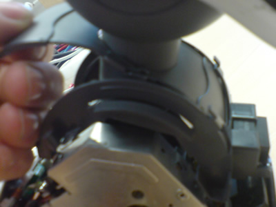 Remove the two screws of motor fixture. Don't lose the fixture rings (small black plastic rings). Imortant: